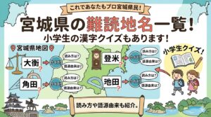 宮城県の難読地名を一覧で紹介!「蒲生」「名掛丁」「南鍛冶町」など、地元民でも読めない地名の読み方・語源・由来を現地取材で解説。小学生の漢字クイズや地域学習にも使えるクイズ付き。今後も随時追加予定!地名の背景を知ることで、旅がもっと深くなる。